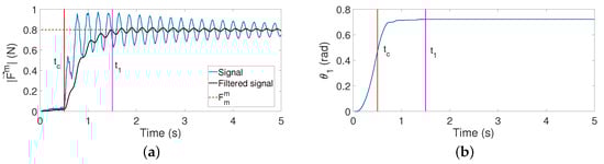 The time is provided by the instant at which the magnitude of the object reaction force provided by the F-T sensor surpasses a threshold of . This threshold value is considered sufficiently high to prevent slipping. Signal often has a vibration of high amplitude, which makes it difficult to obtain . This signal is, therefore, passed through the low-pass filter of Equation (20) tuned with a rad/s, as occurred in Section 5.1, in order to remove that vibration.