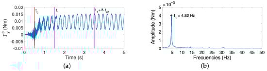 Estimator 1 obtains the fundamental frequency of vibration by calculating the FFT of the moment measured by the F-T sensor in the axis. Figure 13a shows this moment, while Figure 13b shows the magnitude of the FFT applied in an interval of this recorded signal, in the case of an azimuthal movement and a contact in m. Note that: (a) in this case, axis is aligned with axis of the F-T sensor (in the opposite direction), and the signal provided in this direction is, therefore, ; (b) only one peak is observed in Figure 13b; and (c) this peak corresponds to the fundamental frequency of the vibration of the antenna after the impact, which can be easily estimated from that figure.