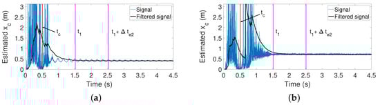 Estimator 2 uses the torque/force ratio of Equation (21) to determine from measurements provided by the F-T sensor. As mentioned previously, in order to speed up the estimation process, the measured force and torque are passed through the low-pass filter of Equation (20) tuned with rad/s. Figure 14a shows the result of 0.44 m yielded by this estimator when the contact is produced in m. Figure 14b shows the result of 0.914 m yielded by this estimator when the contact is produced in m.
