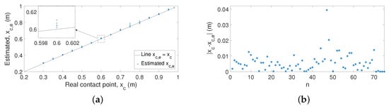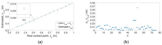 Table 4 provides the details of the results of this second set of experiments. The real value of the contact point, , the average value of the estimator for the five experiments, , the average value of the absolute value of the error of the estimator for each contact point, , the maximum error of the estimator, , and the standard deviation of the error in the estimation, , are shown.
