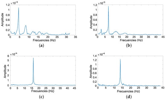 The first drawback was that, in many of the experiments, it was not possible to estimate the second vibration frequency. Figure 19 plots the FFT amplitude of the signals experimentally obtained for several contact points . This figure shows that the frequency of the first vibration can easily be obtained in all cases, but that the peak of the second vibration frequency can be observed only when is close to the base of the antenna, i.e., when m, which are the most unlikely cases. Moreover, in the case of the second vibration mode, this figure shows that the corresponding peak is not sharp, which leads to an inaccurate estimation of the value of the second vibration frequency. In particular, it is impossible to know where the second vibration frequency is in the FFTs in Cases c and d of the figure.