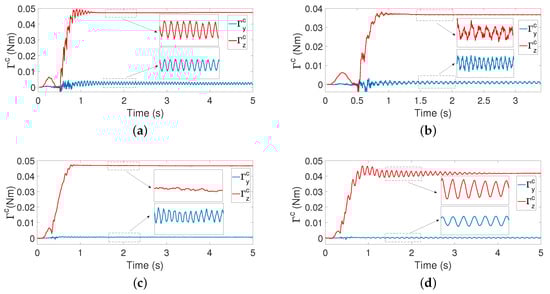 Experimental torques during the estimation process: (a) azimuthal movement with contact point in 0.4 m, (b) azimuthal movement with contact point in 0.7 m, (c) elevation movement with contact point in 0.4 m and (d) elevation movement with contact point in 0.7 m.