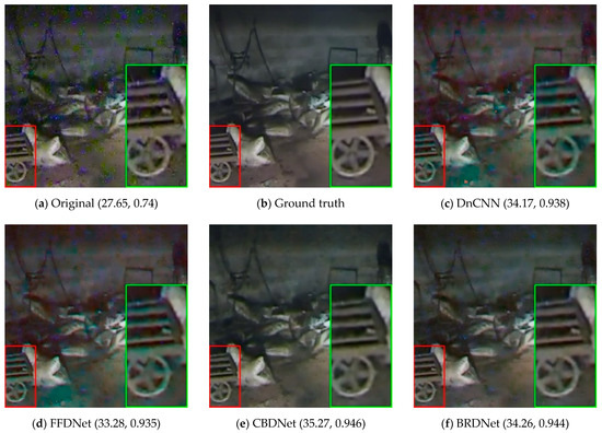 In Figure 8, it can be seen from the top-left noised image that the nuclear noises have irregular aggregated shapes and different colors (blue and green), and there are burrs on the edge of the cart in the image. Although all the CNN-based denoising methods can remove the noises well, they still have some dissatisfied problems. Specifically, DnCNN [16], FFDNet [17], ADNET [20] and DRCNN [21] give the restored image different degrees of color distortion (e.g., some regions are prone to being green). BRDNet [19] and CBDNet [18] do well in color fidelity, but the textures of the wheel in the image are a little fuzzy. However, the result of our method has no color distortion while its edges are clear, indicating that our method does have advantages in terms of texture retention.