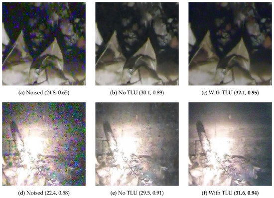As shown in Figure 12, the results with the TLU have better perceptual effects than the results without the NLU in all scenes, i.e., the dark scene, bright scene, and regular scene. Meanwhile, for the quantitative metrics, the results with the TLU are also higher in terms of PSNR and SSIM than the results without the TLU. Therefore, the TLU can obviously improve the overall performance of our image restoration network.