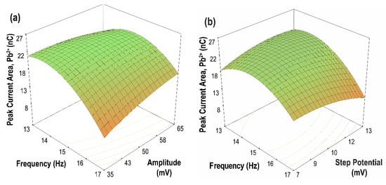 Response surface methodology (RSM) is a powerful statistical tool used for designing experimental conditions and the optimization of process variables [52]. In this study, RSM based on Box–Behnken design (BBD) was used to optimize the SWASV parameters and to evaluate the interaction of these parameters and their effects on the current peak area/charge of Cd(II) and Pb(II) ions. The optimum range chosen for each parameter was based on the current peak area (high sensitivity) and peak resolution of the metal ions, as obtained from the results of the parametric studies. The three-factor, three-level BBD used for optimization comprised the following parameters: amplitude (35, 50, and 65 mV), frequency (13, 15, and 17 Hz), and step potential (7, 10, and 13 mV). The data obtained from performing the sets of runs generated by the optimum range for each parameter were fitted to an empirical model. After this, the correlation of the current peak area for Cd(II) and Pb(II) ions with the three parameters was created. In terms of dimensionless coded values, the quadratic equation for the peak current area is given by Equations (6) and (7), while the model in terms of actual factors is shown in Equations (8) and (9) for Cd(II) and Pb(II), respectively.