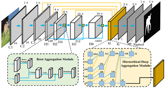 decoding part, we adopt a hierarchical deep aggregation module (H), a convolution layer (FC layer), a deconvolution layer (UP layer), and a sigmoid layer. As shown in
