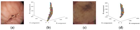 Unlike natural images, WCE images are much smoother and appear to be pink or yellow in general [16]. Another important property of WCE images is that WCE images have strong correlations between color components. As shown in Figure 2. Two typical WCE images are depicted in Figure 2a,c, and their pixel intensities are plotted in R-G-B space in Figure 2b,d. The almost-line shape distribution in the R-G-B space indicates the strong correlations between the three color-components.