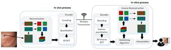 The framework of the proposed method is illustrated in Figure 3. The method can be divided into two parts, i.e., in vivo process and in vitro process. The encoder is in vivo to compress the WCE image data with raw Bayer pattern, and it contains 3D-DCT, quantization, and encoding steps. Decoder and the deblocking algorithm in vitro are for the good visual effect of the reconstructed data. The decoder is the inverse of the encoder, so the 3D inverse DCT, inverse-quantization, and decoding steps are the inverse process of 3D DCT, quantization, and encoding, respectively, which will not be discussed in this paper anymore. Finally, the deblocked Bayer pattern data are interpolated into full-color images for diagnosis. The details will be discussed in the following paragraphs.