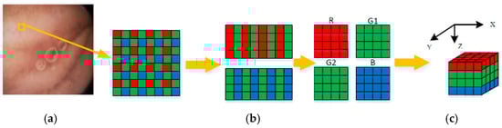 For low power and small size, capsule endoscopies generally adopt the CMOS image sensor. The Bayer pattern, as illustrated in Figure 4a, is widely used for a color filter array (CFA) of such sensors [20]. Different from the RGB image format, the Bayer pattern has only one channel, and the proportion of G, B, and R components is 2:1:1. Therefore, interpolation is required when the Bayer pattern is converted to a full-color image. From the compression viewpoint, the interpolation operations inevitably introduce redundancies before compression. Thus, using the Bayer pattern data directly in compression procedures is a better choice.