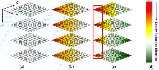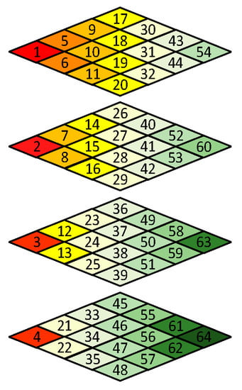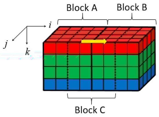 In this method, the 4 × 4 × 4 blocks are directly demosaiced. As shown in Figure 9, a three-dimensional coordinate system is established for each 3D block. Its origin is the upper left corner pixel of the upper surface in each 3D block. Formula (4) illustrates the MSDS along the i-axis direction (the yellow arrow direction in Figure 9. Here A(I,j,k) and B(I,j,k) are spatial-domain matrices of blocks A and B.