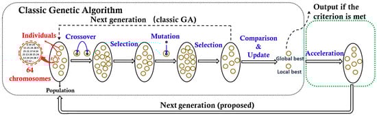 In the classic GA algorithm, the potential quantization tables are regarded as ‘individuals’ colored in yellow, 64 chromosomes in each individual correspond to 4 × 4 × 4 elements in a quantization table. A set of individuals donates as a ‘population’. The population is evolved through the iteration operation, which includes four steps, such as mutation, selection, crossover, and selection. Each iteration would generate a new evolved population as the next generation. The iteration is not stopped until it meets the maximum iteration number (500 iterations are needed in this paper). To guarantee a good global searchability, the individuals in a new generation are generated randomly, which also leads to a low search speed. To improve the search speed, while keeping the individual-diversity, we introduce a PSO based acceleration module to update the individuals closer to the potential optimal ones before the next generation initialized. Here, the acceleration Formula (3) based on the PSO theory [24,25] is adopted to update the individuals.
