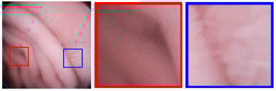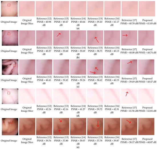In this part, the subjective image qualities of References [12,13,14,15,16,17], and the proposed method are compared. Figure 12 show typical endoscopic images. Figure 12a is relatively flat, (b,d) are images with folds or vessels, (e) has rich villi. Regions with a size of 70 × 70 are sliced from the original images to compare the different methods. As shown in the third, fifth, sixth, seventh columns of Figure 12, the decompressed images of References [12,14,15,16] are suffering from blocking artifacts. Although Reference [15] can achieve a compression ratio comparable to ours, its decompressed results have color distortions, especially in Figure 12b,e. To eliminate the annoying blocking artifacts, References [13,17], and the proposed method leverage different deblocking algorithms. Reference [13] adopts the adaptive deblocking filter (ADF) from H.264 standards, which calculates the intensity variations of the edges and classifies them using quantization-dependent thresholds. It works well in flat regions, such as the fourth columns of Figure 12a,c,d. However, the intensities of real edges in WCE images are ambiguous, some real edges with relatively low quantization degrees could be misjudged and blurred, for example, the upper area in the fourth column of Figure 12b. In the fourth columns of Figure 12e, some blocking artifacts in the villi areas are also misjudged and remained unchanged. In Reference [17], both the low frequency and high-frequency characteristics of adjacent blocks are considered, then a block evaluation criterion with fixed parameters is empirically derived. For the flat image in Figure 12a, the criterion performs well. Once the low frequencies and high frequencies of a block cannot meet the criterion, it will be left unsmoothed, such as the majority of the regions in the eighth columns of Figure 12b–e. In general, except for Figure 12a, the artifacts remain almost unchanged in all images. In this paper, the SMSDS block evaluation criterion is introduced. By assessing the susceptibility to frequency dither, real and false edges can be precisely distinguished. Then, a frequency-domain filter is applied to smooth the false edges adequately with preserving the real edges. As illustrated in the last columns of Figure 12a–e, the proposed deblocking algorithm works well in all situations.