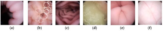 Six typical WCE images from the dataset (Interpolated from raw Bayer pattern) (a,c,e) have rich villi and folds, (b,d) have bubbles, (f) is full of vessels.