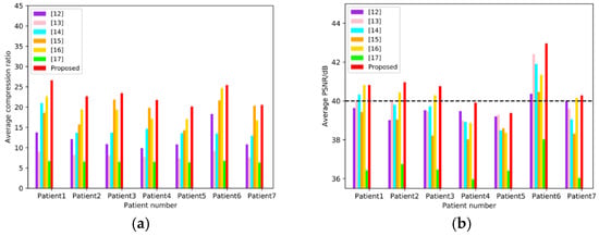 To compare the objective qualities of the proposed method with those of References [12,13,14,15,16,17], the average CR and PSNR of each patient’s images are counted independently, and the results are illustrated in Figure 11. For each patient’s images, the metrics of the proposed method are larger than those of other methods. The average compression results of 7 patients are illustrated in Table 2. Reference [15] yields to relatively high average CR (>18:1), but relatively low PSNR (<39 B), and References [12,13,14] have high PSNR (>39 dB) with relatively low CR (<15:1). Reference [17] has an average PSNR less than 37 dB, as well as an average CR less than 7:1. The performance of Reference [16] can reach average CR > 19, as well as PSNR > 40 dB simultaneously, but ours is the best on both metrics (CR = 22.94:1 and PSNR = 40.73 dB).