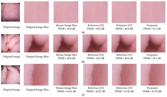 To further validate the effectiveness of the proposed deblocking method, we apply the methods of References [13,17], and the proposed to three mosaic images. As illustrated in Figure 13, blocking artifacts still exist in the results of References [13,17]. For instance, the edges of the folds in Figure 13b,c. Results of the proposed method not only have better visual effects, but also higher PSNR values.