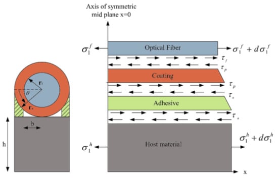 Free body diagram for the symmetrical section of the optical fiber and the substrates together with their relative shear transfer (adapted from [40]).