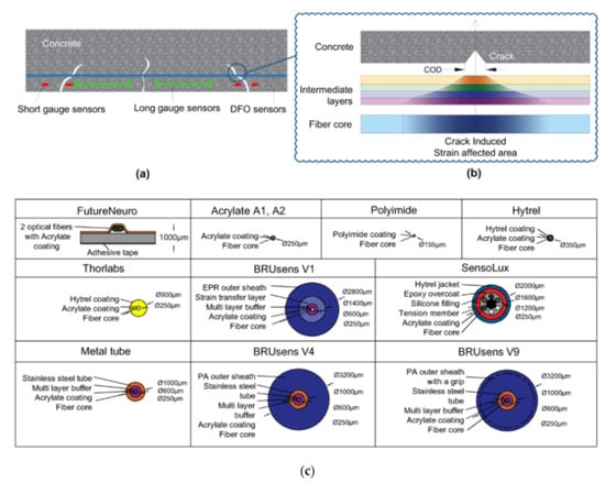 The reader should consider that Figure 4, for the sake of simplicity, only represented a single coating layer between the fiber core and the adhesive but in numerous applications, the intermediate layers are many more, i.e., cladding, reinforcement layers, diverse coatings, jackets, etc. The whole issue is exacerbated in the presence of strain singularities zones where a high-stress concentration is accumulated over a short length of DOFS, such as cracks in RC elements or structural discontinuities. Because the optical fiber bridges the cracks irrespective of whether they are embedded or surface adhered, in order to eliminate this error and guarantee effective measurements, investigation on the strain transfer mechanism from the substrate material (steel, concrete, etc.) to the fiber core is required [19,41]. Alj et al. [42], for example, indicated that the strain transfer process depended on mechanical and geometrical properties of the different intermediate layers, i.e., their elastic modulus, their height and the initial crack opening.