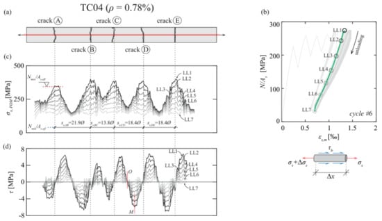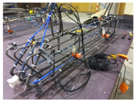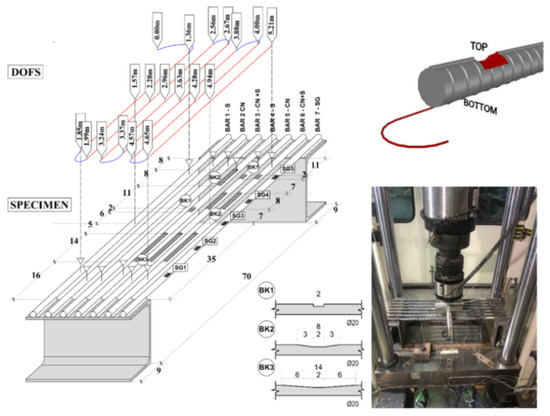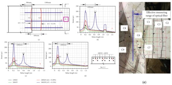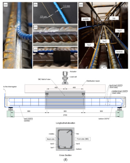 The authors also indicated as a crucial requirement the absence of any influence of the bonding technique on the DOFS sampled strains, thus, the guarantee that what is actually reported by the fiber are the actual strains occurring in the monitored surface rather than a strain present solely in the fiber. The first phase of the test (performed on a bare rebar) assessed that the presence of a layer of silicone and/or the one of a groove had no influence on the extrapolated DOFS when compared to readings performed with a DOFS simply bonded to the rebar with cyanoacrylate. This was proved to be valid both in tension and in bending. The second phase of the test saw the embedment of the instrumented rebars inside a prism of concrete to form multiple RC tensile elements (also named RC ties). These RC specimens were of two kinds, cracking and non-cracking ones designed expressly to study these two different scenarios. Interestingly, during this second test phase, the authors were able to monitor the steel rebars’ strains well beyond the yield limit as testified by the peaks of Figure 7 which are the physical representation of the rebar’s different sections slowly plasticizing one after the other.