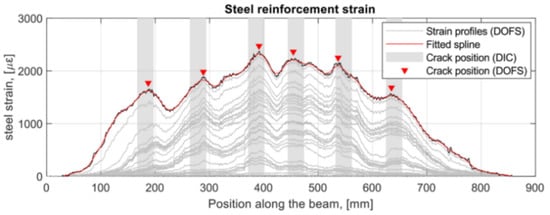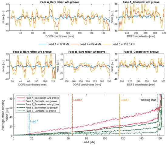 Additionally, as also visible in Figure 7, the oscillations of the profiles, easily confusable with signal noise, were stated to be the influence of the transversal rib on the tensile performance of the rebar. Additionally, it was observed on all the specimens that the magnitude of the defined rib-induced noise became increasingly larger (see Figure 8) with the load thus increasingly disturbing the sought-after signal, that is the strain profile.