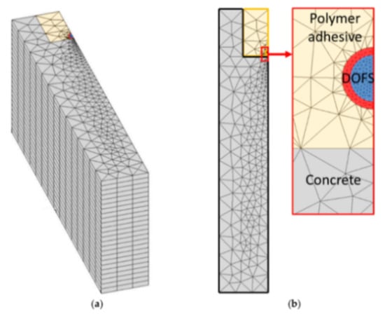 Alj et al. [42] investigated the strain response of thick-coated DOFS sealed in a groove on the surface of a concrete structure using a polymer adhesive and aimed to identify optimal conditions for crack monitoring. Initially, a Finite Element Model was developed (see Figure 10) to understand the strain transfer process between the DOFS core and the host structure which showed that the softer the adhesive is, the lower the strain transferred to the DOFS glass core due to redistribution over a broader length of the sensor (similarly to what was observed in [48,49,50]).