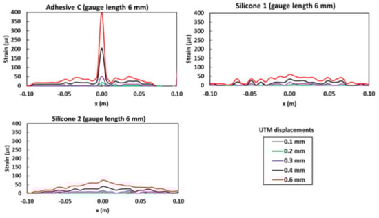 Later, mechanical tests on cylindrical concrete specimens instrumented with a polyimide coated (external diameter 160 μm) OFDR DOFS bonded/sealed using several adhesives proved that strain measurements provided by DOFS were consistent with those from conventional sensors. Furthermore, they confirmed that bonding DOFS to the concrete structure using soft adhesives allowed to mitigate the amplitude of local strain peaks induced by crack openings, which may prevent the sensor from early breakage. Unfortunately, this particular result, also corroborated by the previous articles, cuts both ways as the strain alleviation reduces the sensitivity of bonded DOFS and may alter specifically sought after strain readings. This was evident in the strain profiles provided by the DOFS (see Figure 11) which was bonded to the test specimen with three polymer adhesives used in this experiment (Bi-component epoxy, Mastic silicone and Silicone rubber) and subjected to an actuator displacement reaching 0.6 mm.