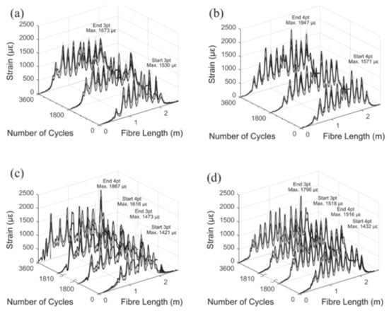 In Barrias et al. [51], the authors aimed at assessing OFDR DOFS’ ability and performance to monitor bridges on a long-term basis thus subjected to a large number of load cycles. The study also studied the magnitude of DOFS debonding and fatigue failure risk. To this end, two similar specimens were submitted to a fatigue test up to 2 million load cycles, the amplitude of which was representative of what is expected on a standard highway bridge under vehicular traffic. According to the authors, the first beam was fatigue loaded in an un-cracked state and its results showed a reasonably good agreement between the DOFS measurements, the theoretical results and the ones measured by the SG as well and for all adhesives tested. The second beam, instead, was intentionally pre-cracked and its results showed how DOFS continued to provide strain measurements coherent with the applied load despite some differences related to the used bonding agents. For example, the best performance was obtained for the epoxy and cyanoacrylate, whose measurements matched perfectly with those from the SG. Larger differences were, instead, observed against the other two bonding agents. Overall, though, neither fatigue failures nor fiber/adhesive debonding were detected.