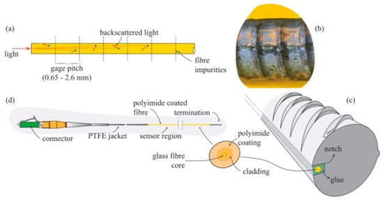 The majority of OFS used in sensing applications have silica (SiO2) glass cores and claddings. The refractive index of the latter is lower than that of the core in order to satisfy the condition of Snell’s law for total internal reflection and thus confine the propagation of the light along the fiber core only [9]. The jacket is usually made of polymeric material or nylon and can vary in diametrical size, shape and manufacturing process. Finally, as will be evident in this article, the external coating can be constituted by numerous kinds of materials, layering, thicknesses and external textures.