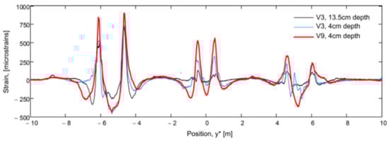 Strain profiles recorded by DOFS bonded to the concrete specimen with three soft adhesives (Bi-component epoxy, Mastic silicone and Silicone rubber) [42].