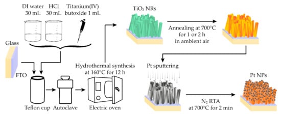 A schematic of the fabrication process is illustrated. The hydrothermal method is employed to obtain titanium dioxide (TiO2) nanorods (NRs) on the substrate of fluorine-doped tin oxide (FTO)-coated glass. After annealing the TiO2 NRs, the agglomeration of Pt is utilized by conducting rapid thermal annealing (RTA) to load Pt nanoparticles (NPs) on TiO2 NRs.