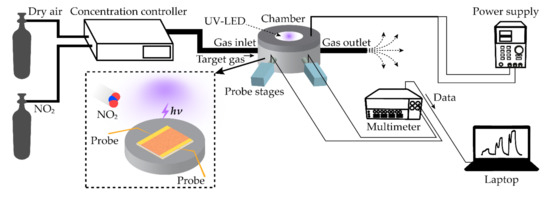 Figure 2 depicts a schematic of an experimental setup where the as-prepared samples were tested for sensing NO2. Dry air and NO2 gas flowed into a customized controller to obtain concentrations, such as 5 ppm, 10 ppm, or 15 ppm. Mass flow controllers and air drive forming machines were deployed in the controller, and the control system was manipulated by using LabVIEW software. The 500 sccm of target gas of which concentration was controlled filled a test chamber and subsequently, flowed out through the outlet. The inset in Figure 2 shows a schematic inside the test chamber. The UV-LED of which wavelength is 370 nm was located on the top inside the chamber and driven by the power supply (MKPOWER, MK3005D, at 20 mA) which was placed outside of the chamber. The UV-LED remained on during the test experiments. The sample of the gas sensor, of which dimensions were 2 cm × 2 cm, was laid on the center of the bottom. The positions of the probes were adjusted with the stages connected through the wall of the chamber. Electrical signals from two probes were sent to the multimeter (Keithley, 2700 Multimeter). Lastly, the data of the resistance was plotted on the laptop. Every experiment was conducted at RT around 20 °C.