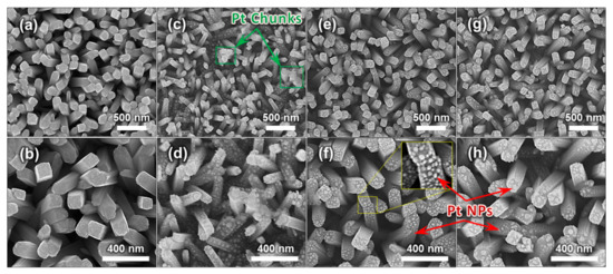 Figure 3 shows the morphology of the samples fabricated following the process depicted in Figure 1. It is confirmed that TiO2 NRs were grown evenly. The average density of the number is obtained as 36/μm2 approximately by counting the NRs in the FE-SEM images of Figure 3. There are adequate sites for the target gas to be adsorbed on the surface, thereby probably increasing the gas sensing performance [22]. Figure 3a–d present the results before and after loading Pt NPs, respectively. TiO2 NRs in Figure 3e–h were annealed for 1 h and 2 h, respectively, and decorated with Pt NPs. Namely, Figure 3c–h are the FE-SEM images of Sensor A, Sensor B, and Sensor C, respectively. Based on the FE-SEM images of Figure 3, the TiO2 NRs have an average diameter of about 83 nm with a standard deviation of around 21 nm. Whereas the size of the Pt NPs in Figure 3c,d is around 13–42 nm, the Pt NPs in Figure 3e,h have the size of 13–18 nm approximately. In addition, as shown in Figure 3c,d, for the TiO2 NRs which did not have an annealing process, the Pt NPs on the top surface agglomerated together to form a chunk of Pt. Lastly, cross-junctions between NRs contacting each other which offer pathways for electrons are observed [34].