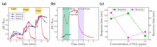 Figure 6 shows the NO2 sensing performances at RT with the UV-LED. The experiments depicted in Figure 2 were conducted for three cases of the samples; Sensor A, Sensor B, and Sensor C. When the sensors were deployed without UV exposure, the read-outs showed only noisy signals. Figure 6a compares the results of the experiments obtained from each sample when the concentrations of the NO2 gas were controlled to be 5 ppm, 10 ppm, and 15 ppm. For comparisons of the performance curve profiles of three sensor types, the resistance increments, relative to the value of the baseline, were normalized with respect to the maximum value of each case; that is, ΔR/Rmax. The baselines were obtained by waiting for 30 min after turning on the UV-LED to stabilize the sensors. The time interval between gas on and off was set to be 3 min. When the sensors are exposed to the NO2 gas, the resistances increase as electron depletion layers become wider. In addition, the increments in the resistances are proportional to the concentration of the NO2 gas. Especially, Sensor C has saturated values of the resistance. As shown in Figure 6a, for 5 ppm, 10 ppm, and 15 ppm NO2 gas exposures, the saturated values in the y-axis of Sensor C are obtained as 25%, 70%, and 100%, respectively. For 10 ppm and 15 ppm of the NO2 gas, it is observed that there are overshoot characteristics, and the overshoot becomes sharper as the concentration of the NO2 gas increases. Although the overshoots occur, the response becomes steady and saturated eventually. Moreover, the sensor makes a complete recovery within 3 min after turning off the NO2 gas. However, Sensor A shows a slow response so that the resistance value does not saturate. Besides, in this case, because the recovery time drags, the sensor fails to make a full recovery. For Sensor B, the rates of the response and recovery are noticeably improved compared to the sensor without annealing. Nevertheless, it is evident that further improvements are still required. Figure 6b enlarges the sensing performance of Sensor C when the sensor was exposed to 15 ppm of the NO2 gas as a representative. Although there was an overshoot when resistance was increasing, the saturation property was confirmed. The response time, the time to arrive at 90% of the saturated value, is obtained as 82 s. When turning off the NO2 gas, the curve makes a complete recovery, and the recovery time—the time to recover 90% from the saturated value to the baseline—is identified as 71 s. Figure 6c depicts the response time and recovery time of Sensor C according to the concentration of the NO2 gas. When the sensor is exposed to the 10-ppm NO2, compared to the 5-ppm NO2, the recovery time shortens, whereas the response takes a longer time because the saturated value is reached after passing through the overshoot characteristic. In contrast, for the higher concentration of the NO2 gas, 15 ppm, response time decreases, whereas the recovery time becomes extended.