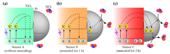 Figure 7 illustrates the proposed mechanism described above. Figure 7a is a schematic of Sensor A. As shown in Figure 6a, this type of sensor had poor performance for the too slow response. It is believed that too many electrons are recombined with the holes, and these electrons cannot be involved in the surface reactions. In contrast, Figure 7b,c depict Sensor B and Sensor C, which have the annealed TiO2 NRs with the improved crystalline characteristics. However, for Sensor B, further improvements in the crystallinity are still required. Further enhancement can be achieved by annealing TiO2 NRs for 2 h. As demonstrated in Figure 5, Sensor C had better crystallinity than Sensor B. Therefore, the photogenerated electrons run swiftly to reach the interface between TiO2 and Pt before recombinations of the electron-hole pairs. The Pt NPs hold the electrons like electron traps by utilizing the Schottky barriers [21,40]. Finally, it leads to the fast sensing response, as demonstrated in Figure 6, by letting the electrons react with the NO2 gas at the surface.