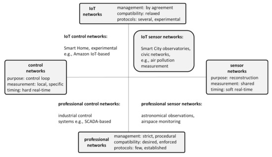 - From the perspective of their purpose, they belong to sensor networks, i.e., networks whose purpose is to reconstruct certain physical phenomena. In contrast, control networks exist to implement the control loop that combines measurement with actions. Sensor networks tend to measure the physical phenomenon that is common to the networks (e.g., water quality, air pollution, etc.), not performing localized measurements characteristic of control networks (e.g., the measurement of the tension or movement). Sensor networks tend to benefit from a soft real time approach where the computation time is not a primary concern.