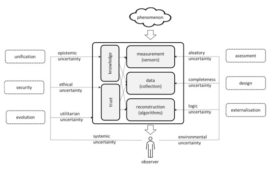 Figure 2 presents the conceptual reference model of the measurement network, used specifically to structure the discussion about uncertainty (the central part of Figure 2) as perceived by the observer. The network is treated as the measurement instrument by which the observer (at the bottom) perceives a physical phenomenon (at the top). The objective of this instrument is to deliver the reconstruction of the phenomenon in a way that is true to the phenomenon and is comprehensible to the observer.
