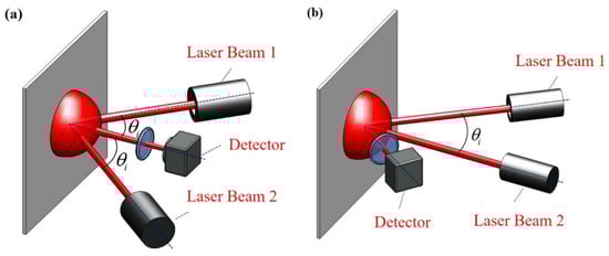 As shown in Figure 2a, for a symmetrical speckle interferometer, assuming that the incident beams are symmetrically angled, the incident angles of the beams will have the same value but the opposite sign, that is θi1 = −θi2 = θi. Assuming that both beams lie on the xz-plane (φi1 = φi2 = 0), then Equation (4) becomes: