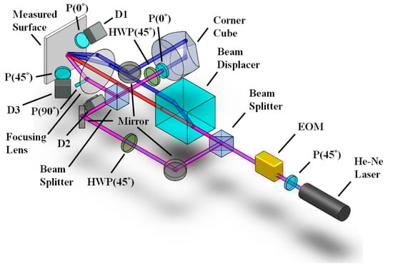 A number of non-contact measurement technologies have been developed, including capacitive displacement sensors, linear encoders, fiber optic sensors, and interferometers, etc., each with their own advantages and limitations. For example, although capacitance displacement sensors typically have a nanometer-level measurement resolution, their measurement range can only reach the micron level, restricting them to small displacement measurement applications [3]. Meanwhile, linear encoders also have a high measurement resolution, but also have a long measurement range. The problem is that most linear encoders are only capable of measuring a single degree-of-freedom (1-DOF), thus limiting their application potential [4]. In contrast, laser interferometers are already widely used in precision metrology applications because of their high resolution, high sensitivity, fast response, and long measurement range [5]. Although laser interferometers generally perform well for a wide range of applications, most can only perform 1-DOF measurement without changing the structure of the configuration of the optical path. If multi-DOF measurement is required, it can only be achieved by altering the existing configuration or by linking multiple sets of interferometer systems [6]. This not only greatly complicates the system configuration, but the build-up of misalignments and positioning inaccuracies tends to have a negative effect on measurement results. Therefore, the development of a long-range laser interferometer system with non-contact measurement capability, which also possesses good versatility for simultaneous multi-DOF displacement measurement is of great importance.