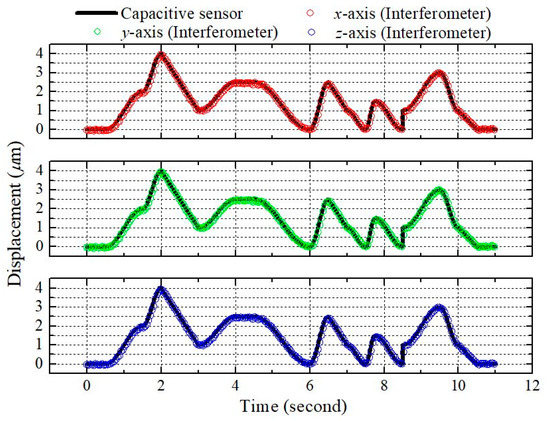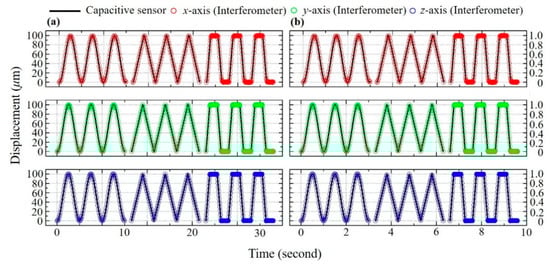In order to estimate the measurement capabilities of the proposed system for various modes of displacement, measurement tests were performed using different waveforms and different ranges. The medium and short-range displacement measurement tests were conducted with a 3-DOF positioning stage. Medium (100 μm) and short (1 μm) range sinusoidal, triangular, trapezoidal and random waveform displacements were performed on both the IP (x, y) and OP (z) axes. The experimental results were compared with the data acquired by the built-in capacitive sensor on the stage. The results are displayed below in Figure 5a,b. An examination of the figures shows that measurement data acquired by the compound speckle interferometer is similar to the data obtained from commercial capacitive sensors for the different modes of periodic movement. Besides, in order to verify the proposed system has high degree of linearity, we calculated the R-squared values of medium- and short-range triangular displacement signals on the x-, y- and z-axis are calculated and listed in the Table 1. It can be seen that the R-squared values are approximately 0.9998 to 0.9984, proving that the proposed system has high degree of linearity.