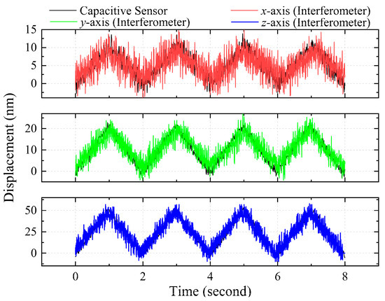 To estimate the measurement resolution of our proposed system, small triangular displacement tests were performed. The positioning stage was driven to perform triangular wave motion displacements of 10 nm, 20 nm, and 50 nm on the x-, y-, and z-axis, respectively and the measurement results are plotted in Figure 7. Clearly, the measurement results of displacements along the x-, y-, and z-axis obtained using our method present a similarly high degree of linearity like those obtained using the capacitive sensor. As is apparent from the experiment results of the small triangular displacement tests, the displacement of approximately 10 nm on the x-axis can be clearly and consistently measured; simultaneously the discernible noise level of a few nanometers can also be clearly detected. In practice, the measured displacement is composed of the actual motion signal, as well as the low and high frequency noises. In general, low frequency noise results from background vibration and thermal drift while the high frequency noise comes from the laser light source, the photodetector, and the system’s electronics. Since the experiments in question involve a series of rapidly changing displacements within a short period of time, the effects of low frequency noise can be ignored. After calculating the experiment results of the small triangular displacement tests, the calculated standard deviation (σ) of the noise level on the x-axis is found to be approximately 2.03 nm, which can be regarded as the measurement resolution. Similarly, the calculated standard deviations (σ) of noise level on the y- and z-axis are found to be approximately 2.79 nm and 5.41 nm, which can be considered as the respective measurement resolutions. Additionally, it is worth noting that the calculated root-mean-square (RMS) values are also similar to the standard deviation (σ) values of the noise on each axis. As such, the standard deviation (σ) of the noise level is adopted as the measurement resolution of our proposed method, which can be found to be approximately 2.03 nm, 2.79 nm and 5.41 nm on the x-, y-, and z-axis after calculation.