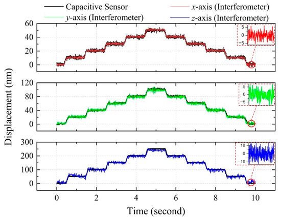 In order to evaluate the repeatability of the proposed system, the positioning stage was set to move by 5 steps back and forth along each axis. As shown in Figure 8, the displacement on the x axis is 10 nm per step (red solid line); the displacement along the y-axis is 20 nm per step (green solid line) and the displacement along the z-axis is 50 nm per step (blue solid line). We applied the statistical method to evaluate the repeatability of measurement results, with the standard deviation (σ) of the measurement results for 50 step displacement tests, as demonstrated in the aforementioned studies, and the results on the x-, y-, and z-axis are shown in Table 2. It can be seen that the calculated standard deviation (σ) of the step displacement tests on the x-, y-, and z-axis are approximately 0.17 nm, 0.34 nm and 0.85 nm, respectively.
