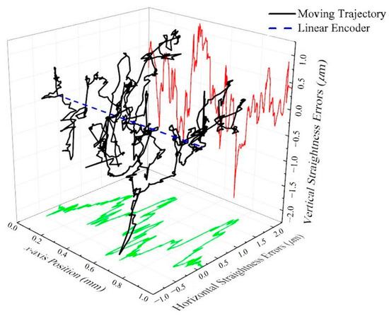 In order to verify the proposed system is capable of measuring 3-DOF displacement simultaneously, a straightness error measurement experiment for a travel range of 1 mm along the x-axis was conducted. In this experiment, we use a processed aluminum block (Surface roughness Ra: 2.06 μm) as the measured object to prevent the surface from being flat enough to affect the measurement results. Then, the stage was moved along the x-axis while the measurement results of our proposed method on the x-, y-, and z-axis were utilized to provide the information of positioning, vertical straightness, and horizontal straightness, respectively, which is shown in Figure 9. It can be seen that the blue dotted line represents the displacement conducted by the linear encoder; while the black solid line represents the trajectory of the straightness, which the value of vertical straightness is projected onto the right-hand surface with red solid line, and the value of horizontal straightness is projected onto the bottom surface with green solid line. It can be known from the results that the vertical straightness is within 2.14 μm and the horizontal straightness is within 1.81 μm, respectively, proving that the proposed system can provide not only the displacement but also the vertical (y-axis) and horizontal (z-axis) straightness simultaneously with the object surface of different materials.