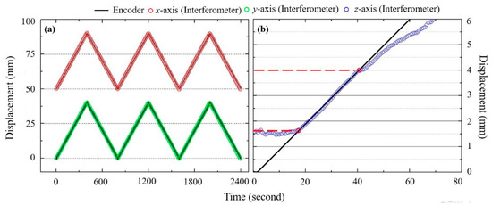 Owing to their non-contact mode of measurement, speckle interferometers technically have an unlimited range when it comes to IP displacement measurement. In practice, however, the maximum measurement distance is still limited by the measurement surface and the positioning stage itself. In order to determine the consistency for IP displacement measurement over long distances, the long-range displacement platform is set to travel a distance of 40 mm, the longest stable displacement the platform is capable of, along the IP axes x and y. The proposed system was set to measure for an entire stroke. A comparison of the results with those obtained with the platform’s built-in linear encoder is shown in Figure 10a. The results demonstrate that the system is fully capable of accurately measuring long-range displacements along both IP axes.