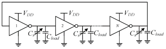 where it is assumed that the average current is equal for all the stages. The rightmost approximation in Equation (3) holds assuming small capacitance variations (Although Equation (3) shows a hyperbolic dependence on ΔC, it can be approximated with its series Taylor expansion truncated to the first term which is equal to the rightmost term of (3)). From Equation (3), it is apparent that the frequency difference is increased when Cload and N are decreased (i.e., when the nominal oscillation frequency is maximized). This can be achieved by reducing the parasitic capacitance of the inverters, by reducing the nominal value of the sensing capacitor and, in particular, by adopting the minimum number of stages.