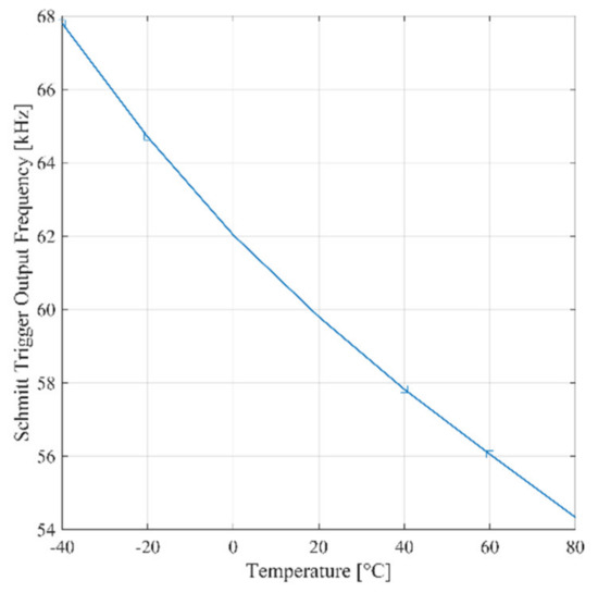 The frequency of the signal at the output of the Schmitt trigger as predicted by Equation (3) is proportional to the average charge current. Consequently, it is expected that the frequency varies with temperature. By inspection of Equation (1), the same conclusion applies for the reference ring oscillator. As a confirmation of these observations, Figure 6 shows the post-layout simulation of the frequency of the signal at the output of reference oscillator and the Schmitt trigger, respectively, versus temperature for ΔCi = 1 fF. The temperature coefficient of the signal at the output of the trigger over the industrial temperature range (−40:80°) is equal to −108 Hz/°C, while the one of the reference signal is equal to −126 kHz/°C. The simulation results in Figure 6 is coherent with the analytical model carried out in Section II.A, as detailed in Appendix A.