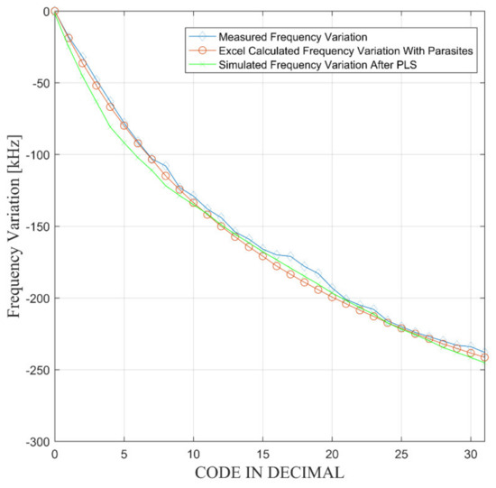 Figure 9 reports the comparison between the frequency variation predicted by Equation (3) introducing the trimming capacitance Equation (9), the post layout simulations, and the measurement results. It is apparently a good fit between the three curves.