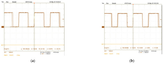 The measurements have been carried out through the deposition of talcum powder particles (εr = 2) over the sensing capacitors. During experimental measurements, three main cases have been considered for the electrode coverage, namely low coverage, medium coverage, and high coverage. Figure 11 shows the microphotograph of the electrodes in the three considered conditions. Measured signals at the output of the trigger are reported in Figure 12. In the first case (low coverage), the measured Δf is equal to 5 kHz, which corresponds to a total capacitance variation of ΔC = 83 aF. In the second case (medium coverage), Δf = 10 kHz that is related to a total capacitance variation ΔC = 166 aF. Finally, in the last case (high coverage) Δf = 18 kHz and ΔC = 300 aF.