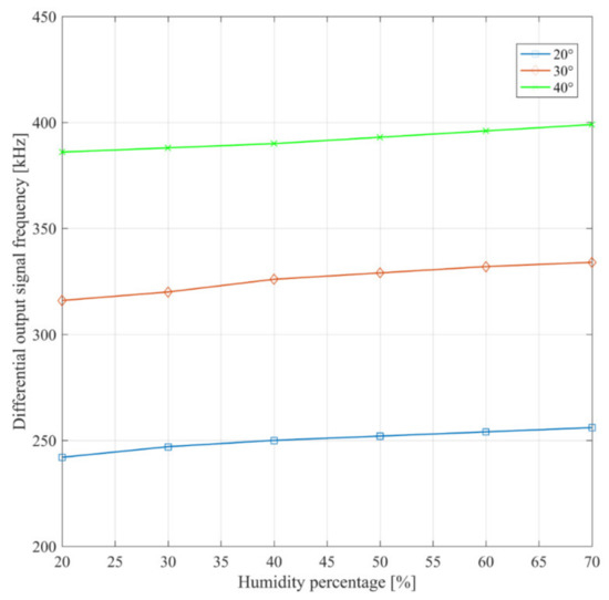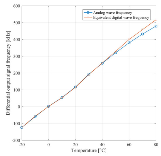 With the purpose of also demonstrating the temperature behavior expressed in the second section, measurements inside a controlled oven were executed, whose results are shown in Figure 13. The measured curve shows a positive temperature coefficient equal to 6 kHz/°C. Although this behavior seems at first sight to contradict the results reported in Figure 6, it is coherent with the analytical evaluation reported in the Appendix A. Indeed, in experimental measurements the passivation of the reference capacitor led to a load capacitance of the reference RO higher than that of the sensing RO. Consequently, as predicted by (A4) in the Appendix A, the temperature coefficient is positive.