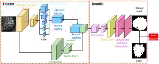 The structure of DeeperLabC model shown in Figure 1 is divided into encoder and decoder. Initially, the semantic feature maps of the input image to be segmented are obtained by the skeleton network. Low-level features with more texture information are further down-sampled by convolution and Space2Depth (S2D) operations. High-level features are extracted from different receptive fields by Atrous Spatial Pyramid Pooling (ASPP). At the end of the encoder, low-level features after convolution and high-level features extracted by ASPP are stacked on the channel dimension. In the decoder, after a series of convolution operations, the depth to space (D2S) and linear interpolation are used to up-sample the feature map to the size of original image.