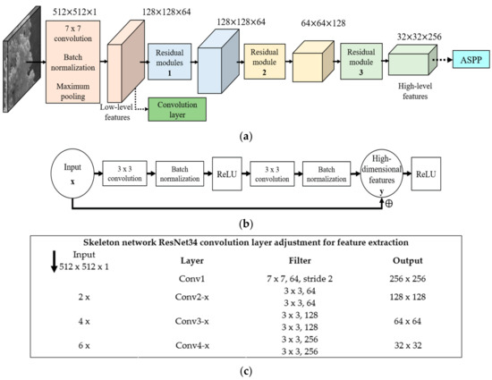 Figure 2 shows the adjusted ResNet34 with residual modules, where the input image is processed by the first layer convolution, batch normalization, and maximum pooling to get the low-level features, which are input into the subsequent convolution layer. To cope with the high processing and large number of deep network parameters, the original ResNet34 model is fine-tuned by pruning the last residual block while maintaining the classification accuracy of the network. The resultant skeleton network contains three residual blocks with 26 convolution layers. After three residual modules, the high-level features are obtained with dimensions reduced to 1/16 of the original input, but the number of channels increased from 1 to 256. Residual block convolutional layers are presented in Figure 2b,c.