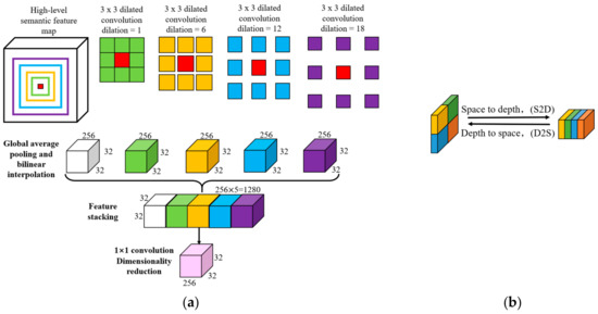Network modules: (a) Atrous Spatial Pyramid Pooling (ASPP) module in DeeperLabC; (b) S2D and D2S transformation of the feature map.